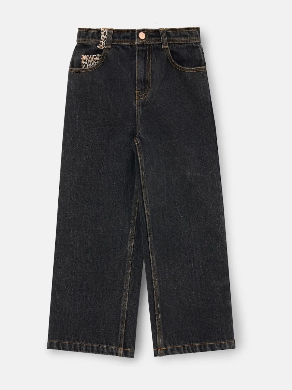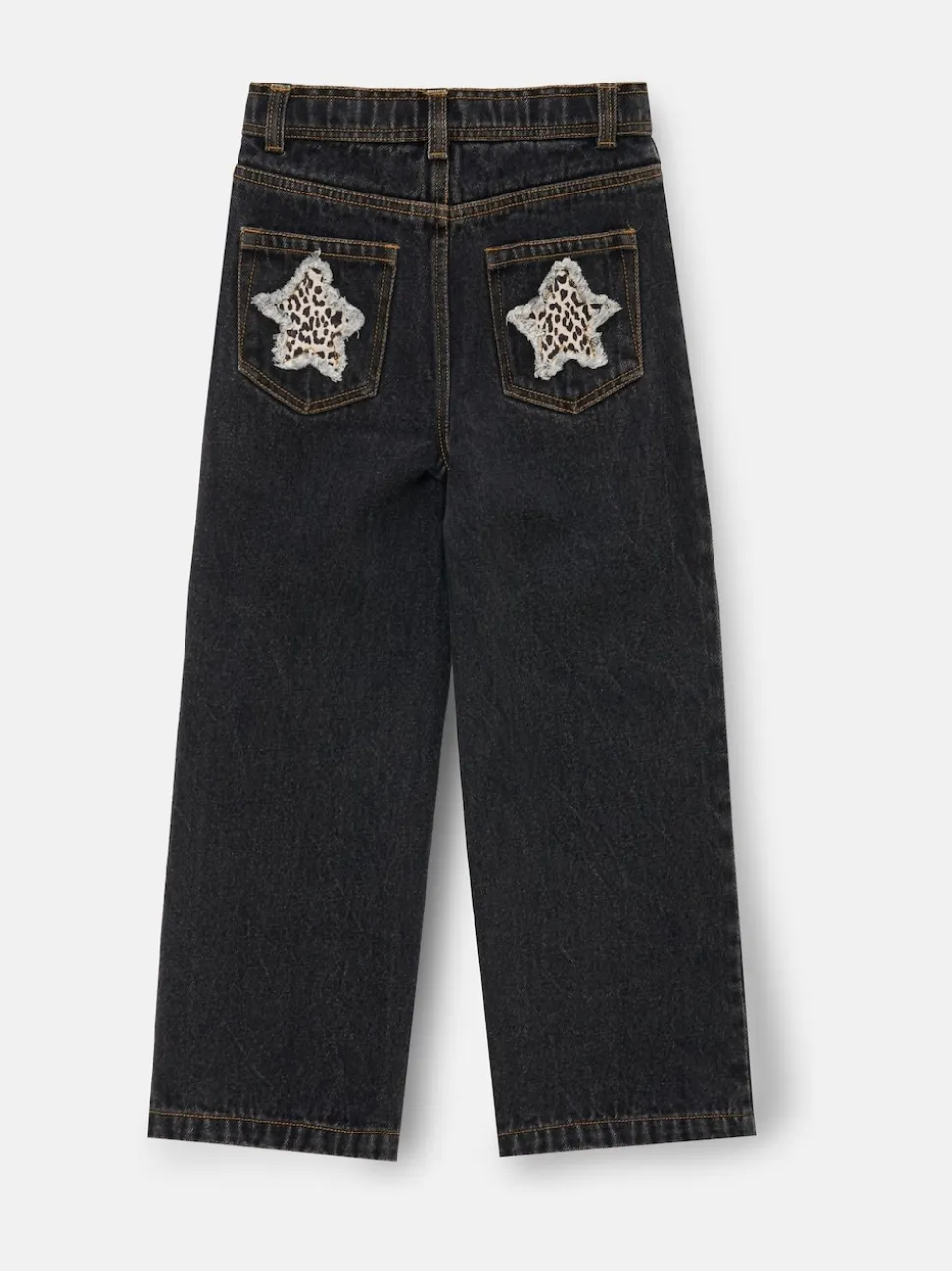 She’s got star quality! These washed black jeans zare the perfect wide-leg cut with a frayed hem and fabulous leopard print appliqué stars on the back pockets. Just tuck in your favourite knit or tee! Machine washable. 100% Cotton.