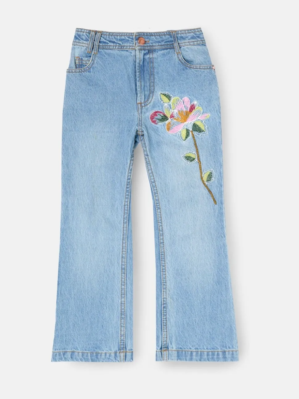 Say hello to your new favourite jeans – with a floral twist! Cut into a flare fit in a mid wash, this jean is embellished with a bold flower embroidery down one leg. Full of personality, they’re perfect for styling with EVERYTHING this season. Machine washable. 100% Cotton.