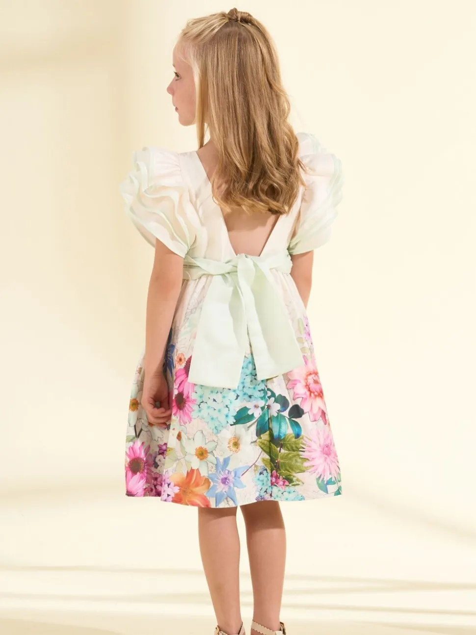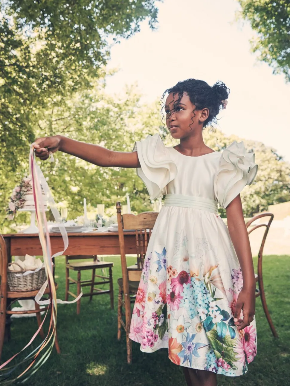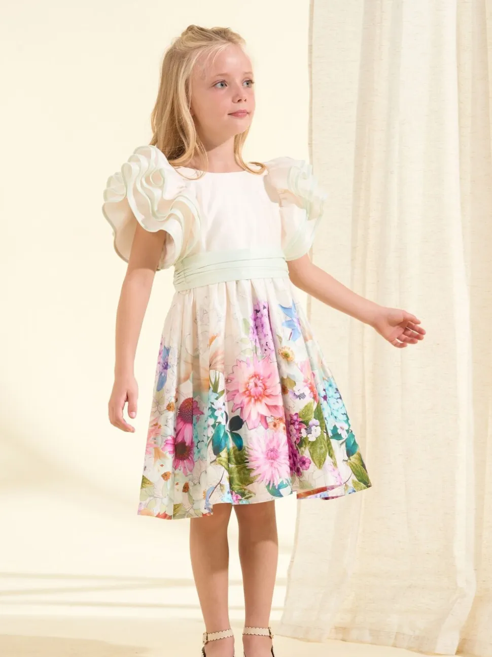 Make a serious style statement in our new Emilie dress. A stunning polished cotton occasion dress with a delicate floral border print. The outstanding feature of this dress is the statement sleeve characterized by multiple layers of ruffles edged in satin creating a bold look. Finished with a rich blue satin sash. Simply exquisite. Machine washable. 100% Polyester.