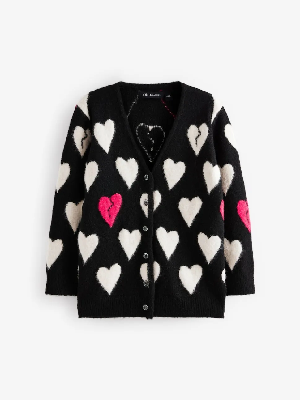 Show her wardrobe some love with the Amore Hearts Cardigan from smALLSAINTS. Knitted in black with an all-over white and red heart pattern, this longline loose-fit statement piece has been designed with a V-Neck and front button fastenings. Layer it up over a T-Shirt and leggings outfit with boots. Button closure V-Neck Long sleeve Longline fit Machine washable. 90% Polyester, 6% Wool, 4% Elastane.