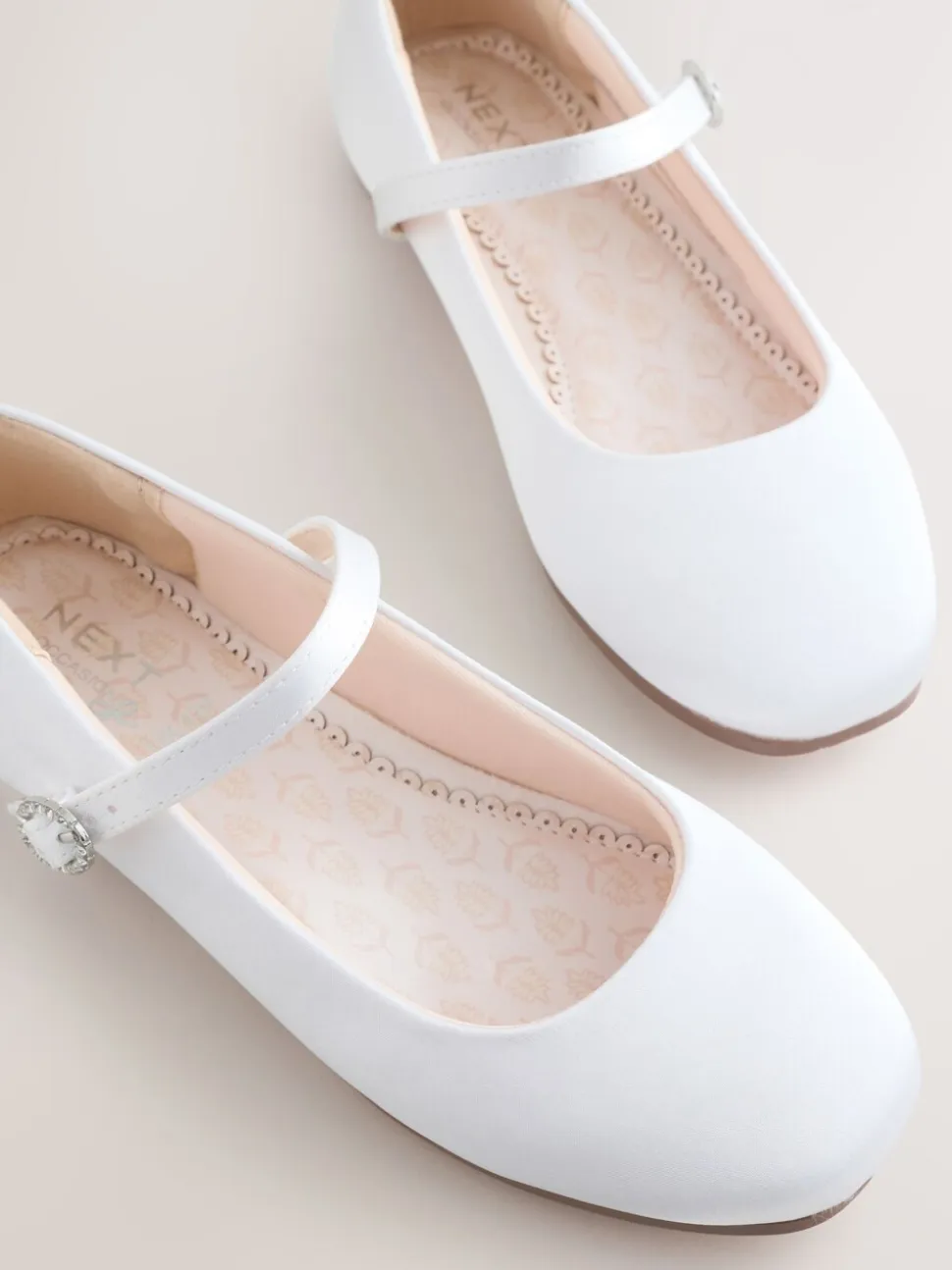 Ensure she shines on her special day with these dazzling White Satin Mary Jane Occasion Shoes, perfect for weddings and special occasions. Featuring a beautiful finish, secure true buckle fastening, and a slip resistant sole, the padded heel and lining ensure all-day comfort. Mary Jane Occasion Shoes Dazzling finish Features true buckle fastening Includes padded heel and lining Designed with a slip resistant sole Standard Fit Upper – Textile, Lining & Sock – Textile, Other Materials, Sole – Other Materials.