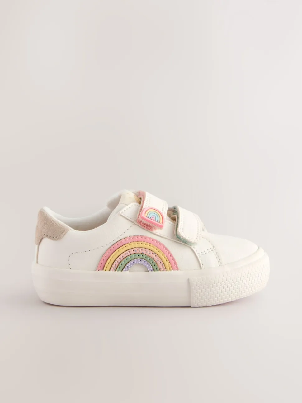With a classic design and dual touch-fastened straps for easy wear, these white trainers are perfect as an everyday option, featuring a faux leather upper with rainbow detailing, a round toe and a textile lining, finished with a slip resistant sole. Wide fit (G) Faux leather upper Round toe Touch fastening Textile lining Slip resistant sole Upper – Other Materials, Leather, Lining & Sock – Textile, Sole – Other Materials.